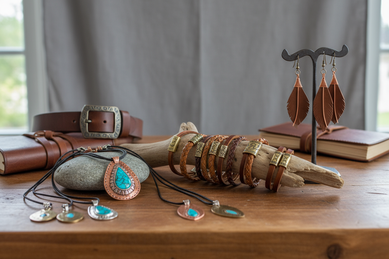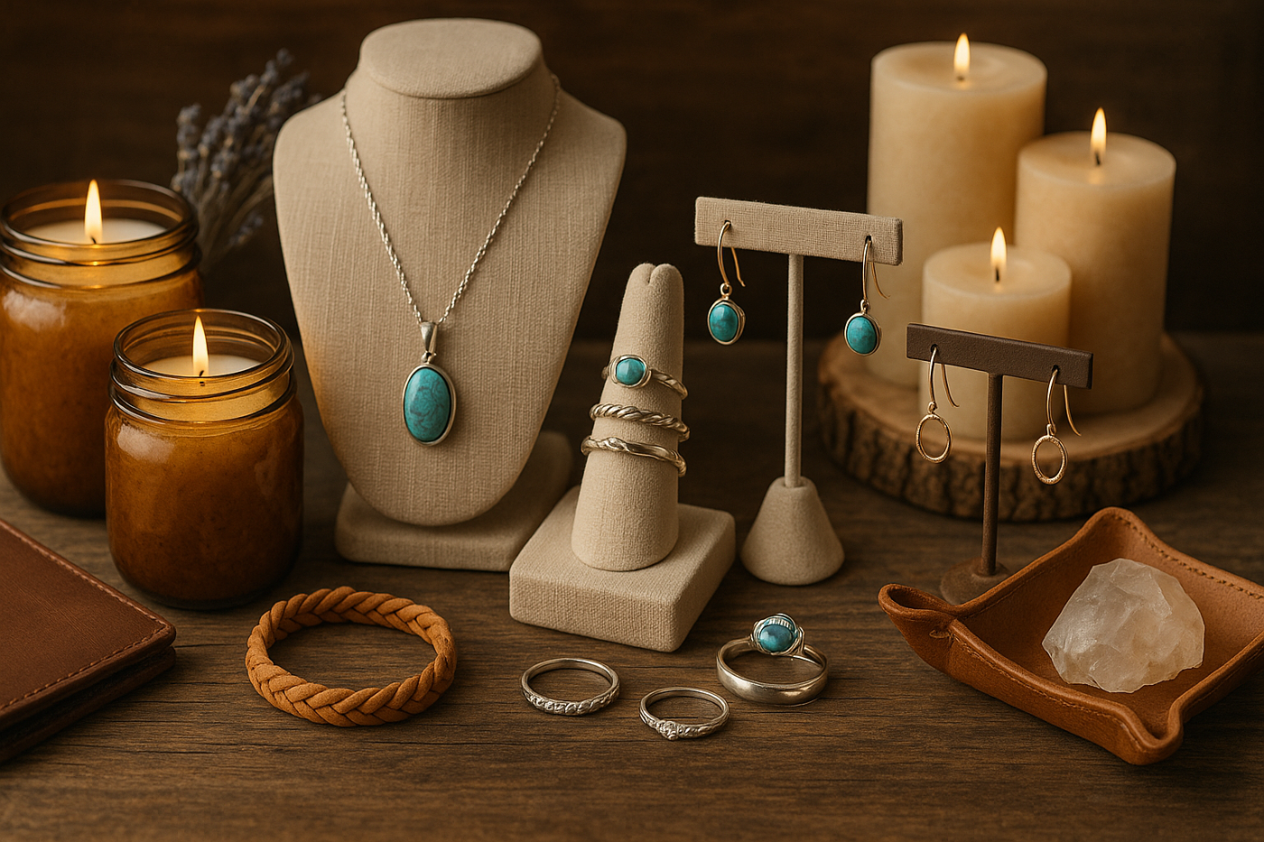 Our collections blend handmade jewelry, candles, and leather goods with curated home décor and estate finds, bringing together craftsmanship and character in every item.